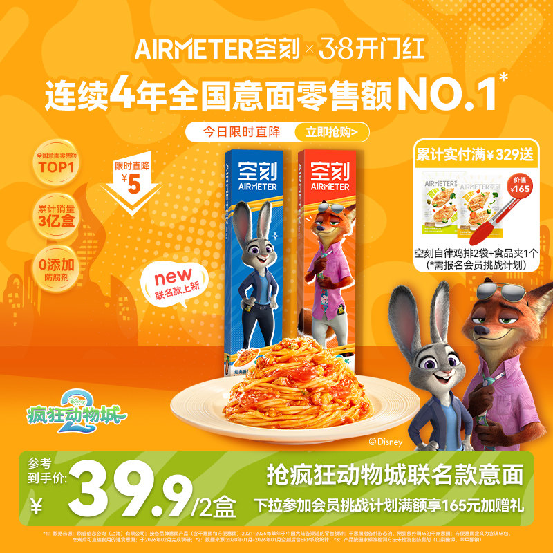 空刻疯狂动物城联名款经典番茄肉酱意面儿童速食早餐意面尝鲜2盒