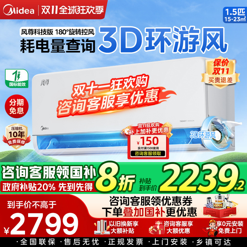 • 泡美丽»»美的空调风尊挂机大1.5匹新一级变频冷暖家用官方旗舰科技版