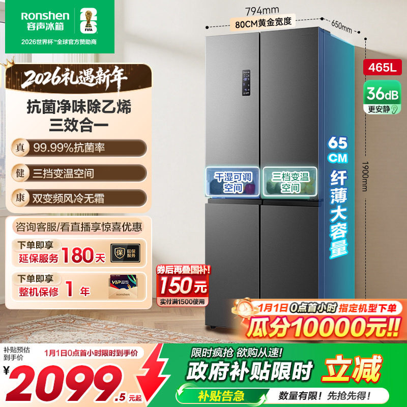 容声465L十字双开四门大容量一级风冷无霜薄嵌入家用冰箱换新补贴