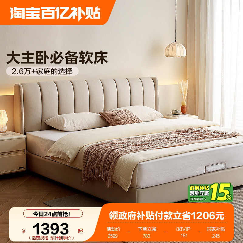 • 泡美丽»»全友家居奶油风琴键双人大床主卧室软包床科技布艺高箱储物落地床