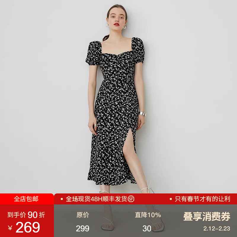 范洛2026夏季新款法式方领碎花连衣裙女黑色显瘦开叉泡泡袖长裙子