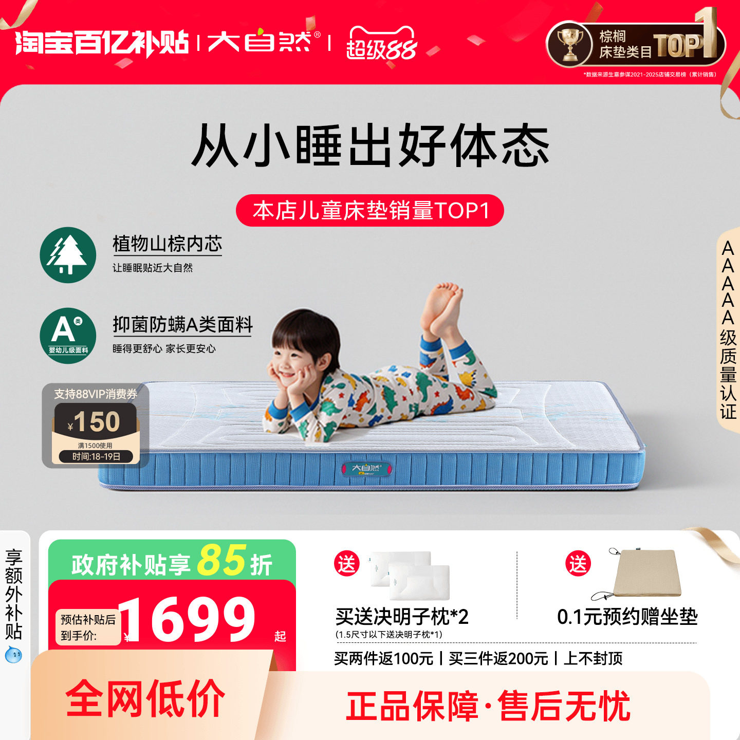 政府补贴15%大自然5A级儿童家用护脊山棕床垫软硬抑菌防螨青少年