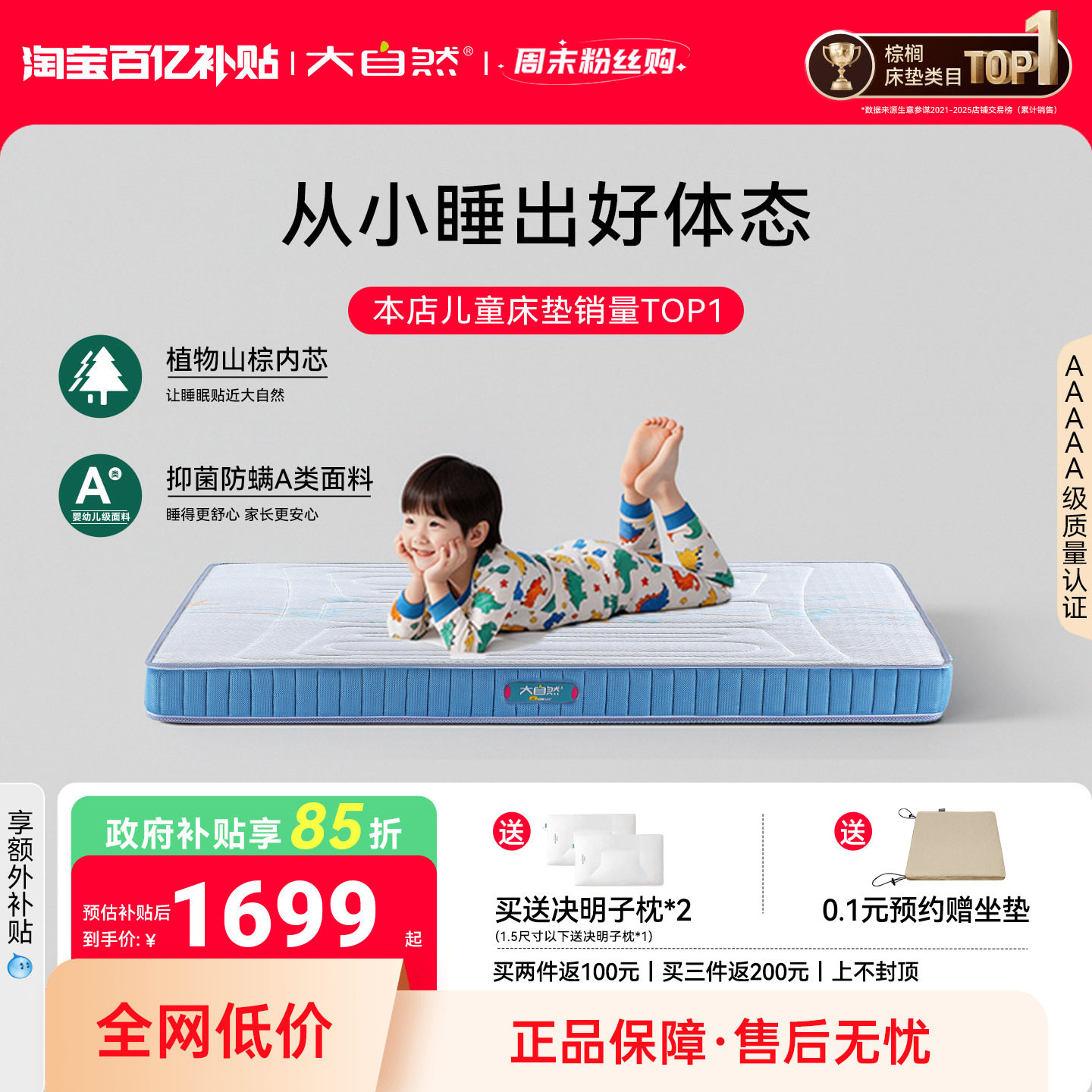 政府补贴15%大自然5A级儿童系列护脊山棕床垫软硬抑菌防螨青少年