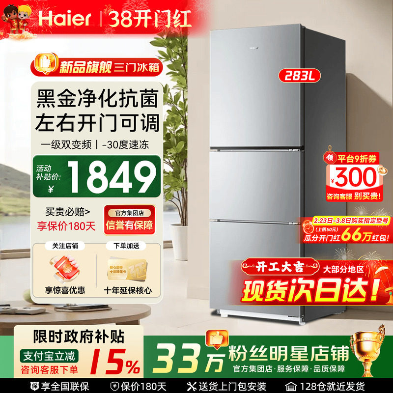 [政府补贴]海尔电冰箱226L无霜家用小型双门三门变频283L一级能效