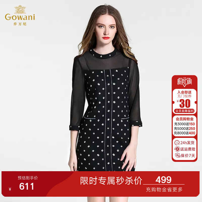 乔万尼商场季新款拼接蕾丝中裙气质黑白波点打底七分袖连衣裙