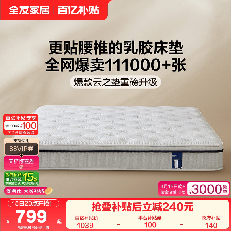 全友家居进口乳胶床垫卧室软硬适中双人椰棕席梦思180x200床垫子