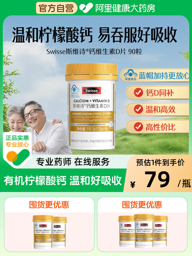 Swisse斯维诗柠檬酸钙维生素D成人蓝帽认证90粒钙片中老年人铁锌