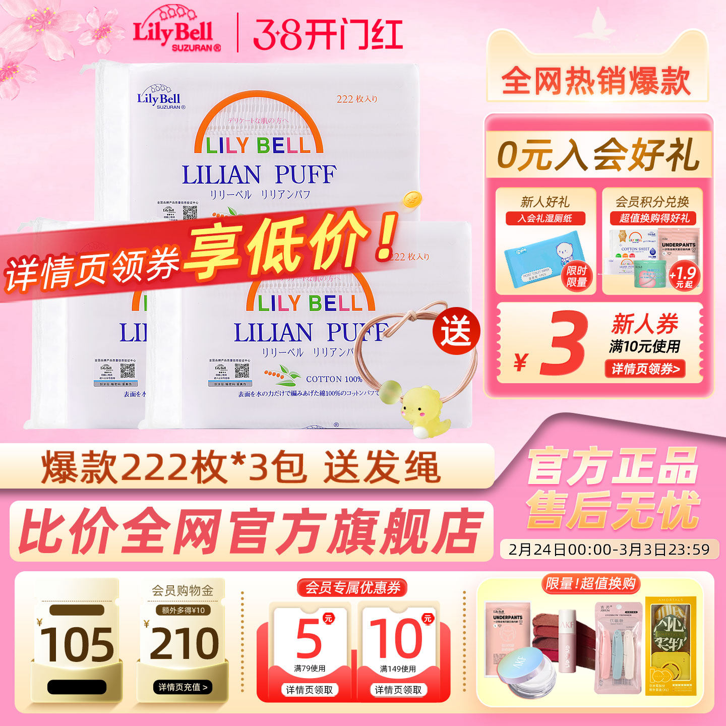 【官方】Lily Bell丽丽贝尔经典化妆棉省水湿敷全棉卸妆棉222枚*3