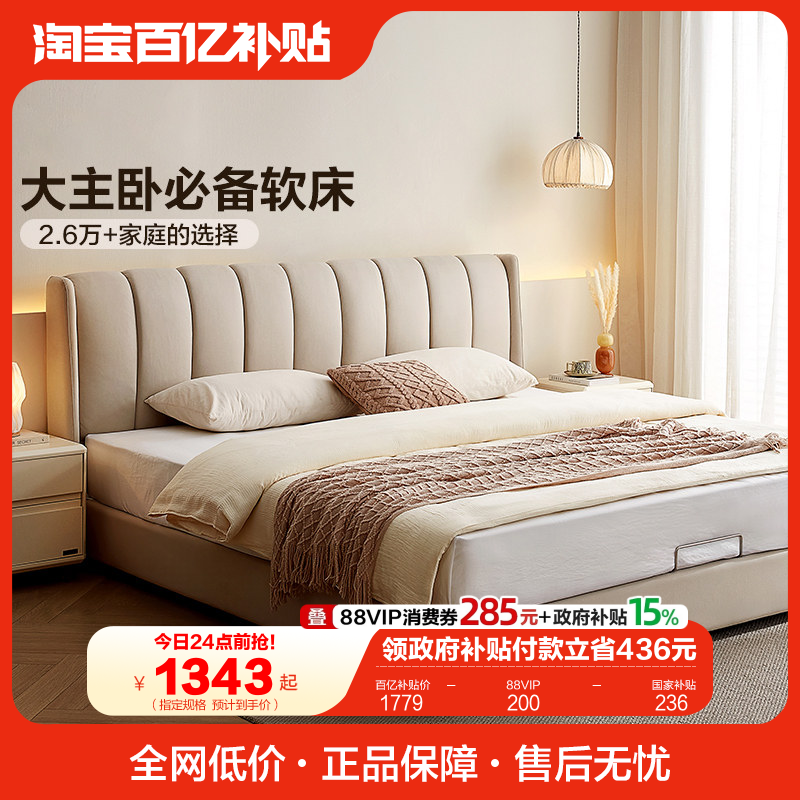 全友家居奶油风琴键双人大床主卧室软包床科技布艺高箱储物落地床