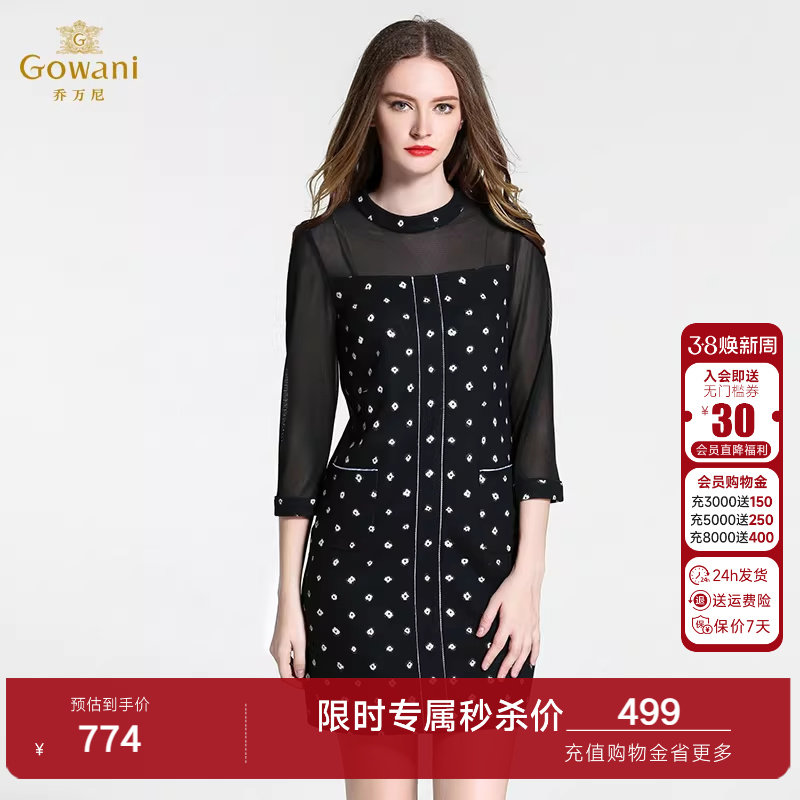 乔万尼商场季新款拼接蕾丝中裙气质黑白波点打底七分袖连衣裙