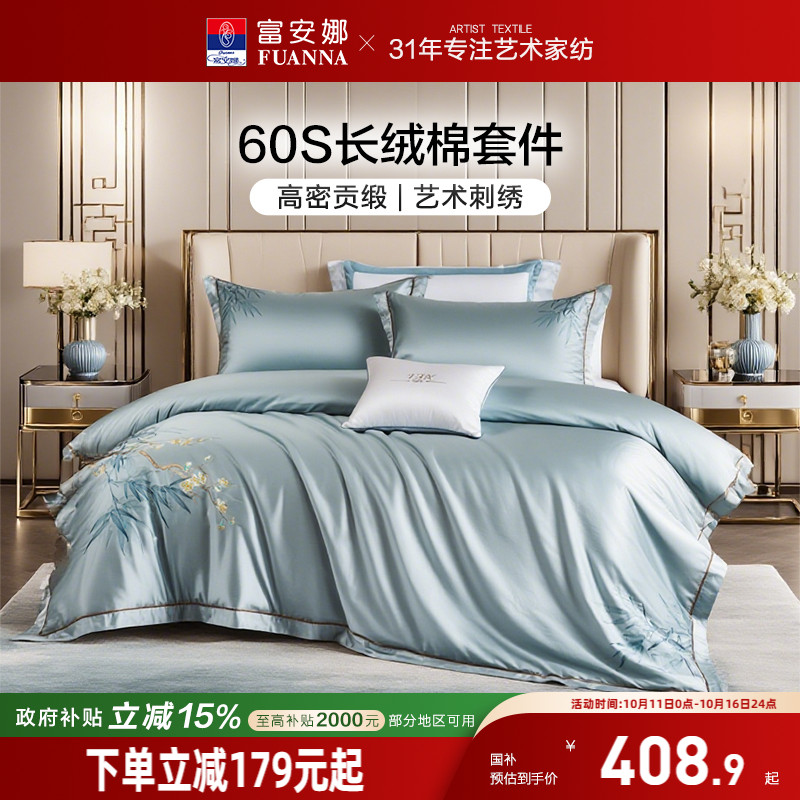 富安娜家纺60支长绒棉四件套纯棉床单被套贡缎床笠轻奢床上用品