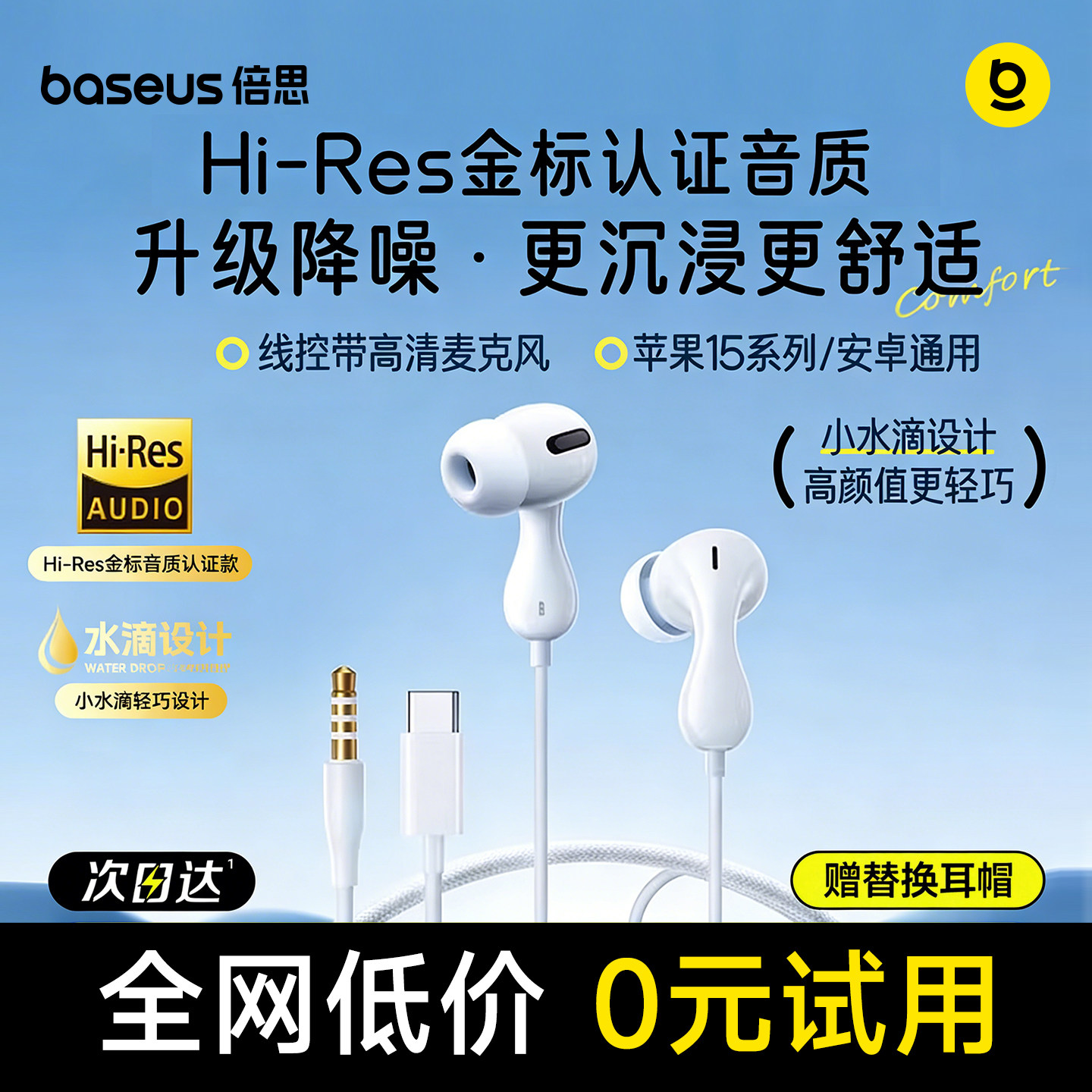 倍思有线耳机降噪入耳式3.5mm圆typec适用iPhone15华为小米苹果17