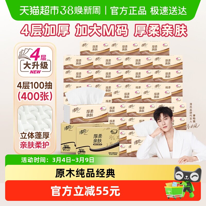 【李昀锐同款】下拉享优惠清风抽纸厚柔原木4层100抽48包M码纸巾