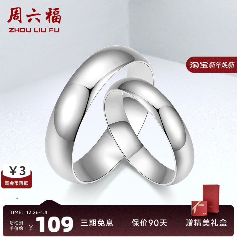 周六福S925纯银情侣一对戒指男女简约素圈纪念生日礼物送女友礼物