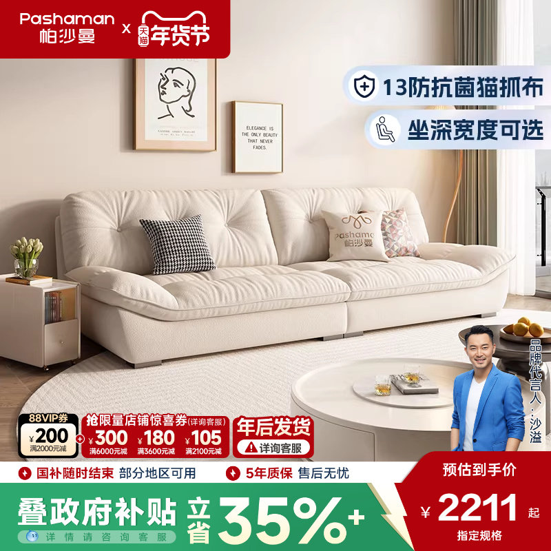 帕沙曼云朵沙发客厅现代简约小户型直排奶油风布艺沙发猫抓布抗菌