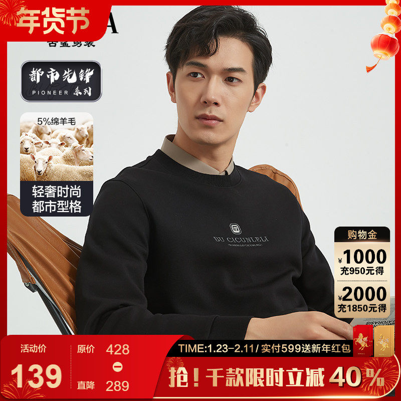 • 泡美丽»»【绵羊毛卫衣】古鲨黑色长袖T恤男轻奢简约圆领修身休闲春装新