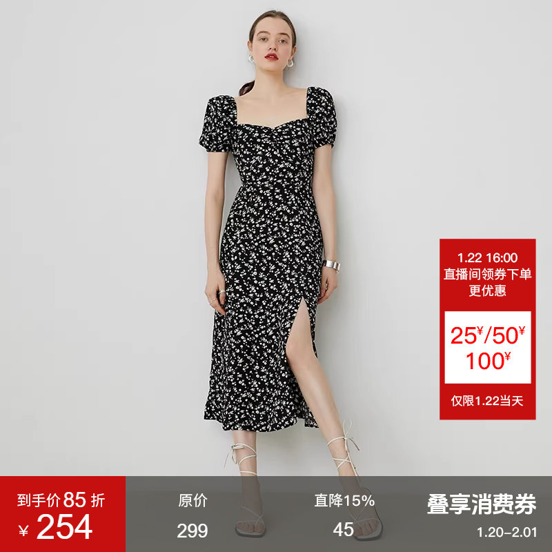 范洛2025夏季新款法式方领碎花连衣裙女黑色显瘦开叉泡泡袖长裙子
