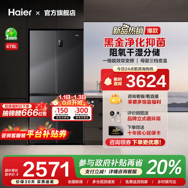 [换新补贴]海尔478L四门十字双对开门家用变频一级能效无霜电冰箱
