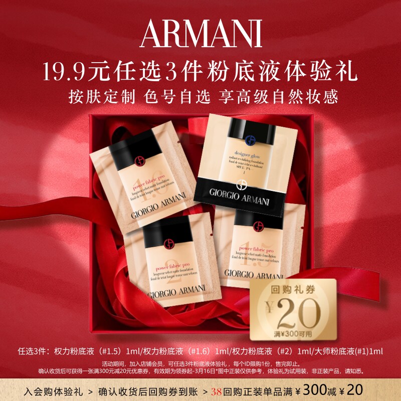 【19.9任选3件加购付款】阿玛尼权力大师粉底液体验 享20元回购券