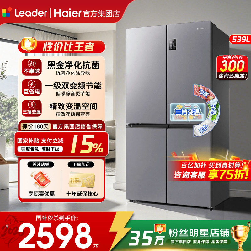 • 泡美丽»»国补15%]海尔冰箱539L升超大容量统帅家用一级变频十字四门旗舰店