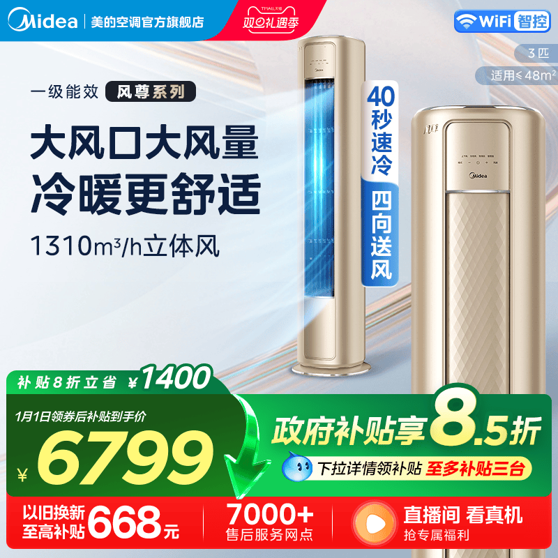 美的空调3匹智能变频一级能效立式柜机客厅家用节能冷暖两用风尊