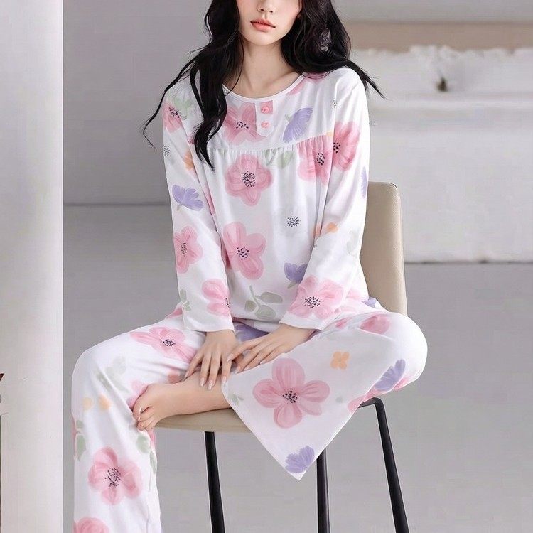 春秋女式妈妈棉绸薄款长袖大码宽松空调睡衣东方绵绸人造棉套装