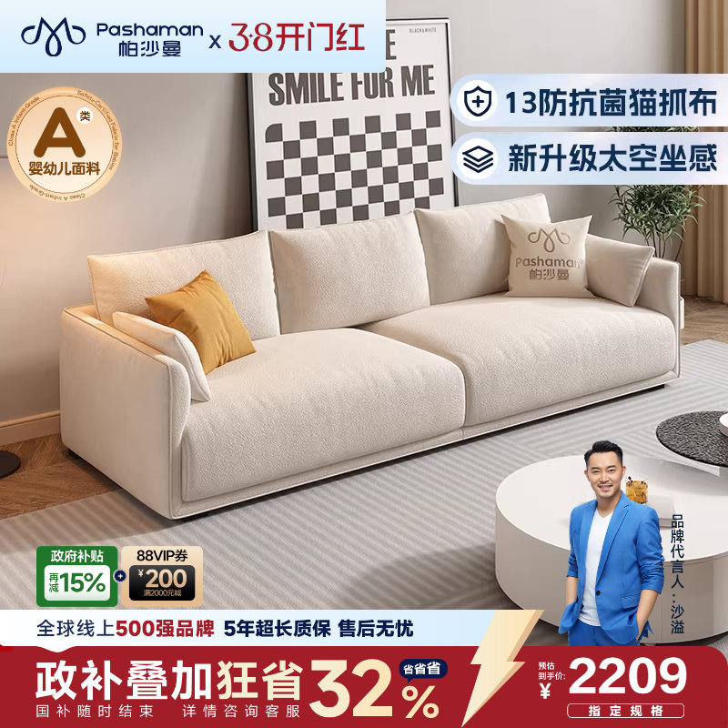 帕沙曼新款布艺沙发小户型客厅北欧简约奶油风模块直排猫抓布宠物