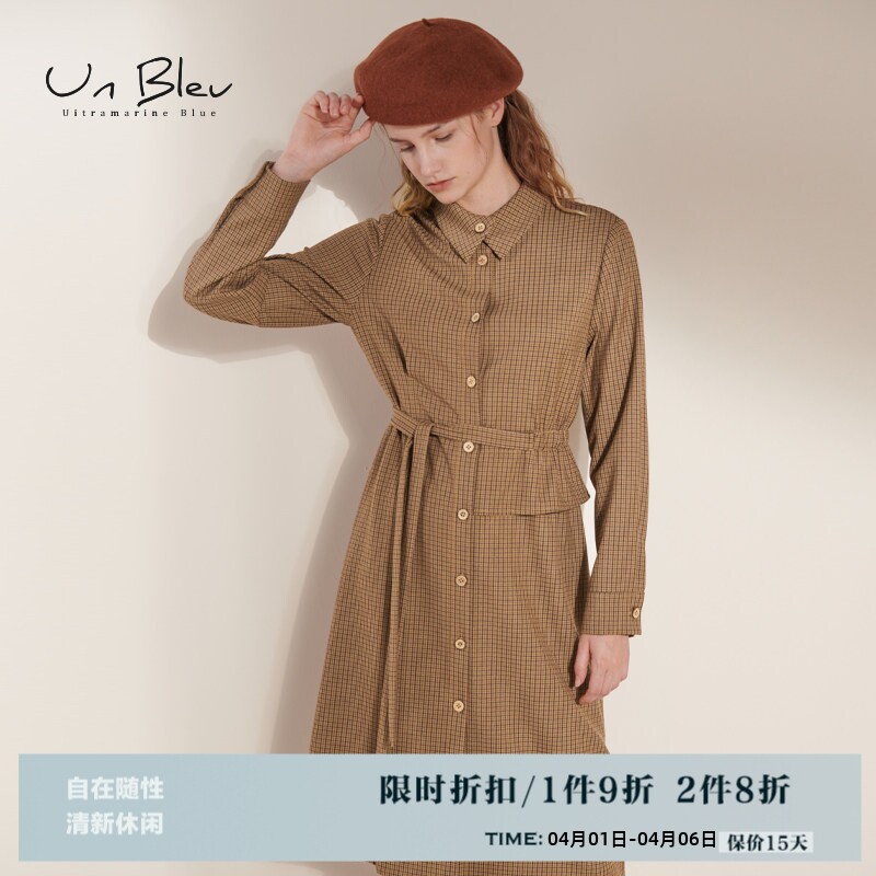 unbleu衬衫连衣裙女2025春秋季新款文艺复古高腰中长款格子长裙女
