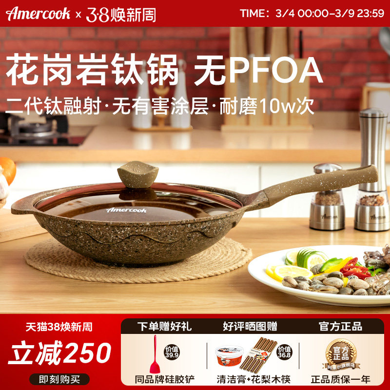 amercook阿尔菲塔麦饭石花岗岩钛炒锅不粘锅家用炒菜锅燃气电磁炉