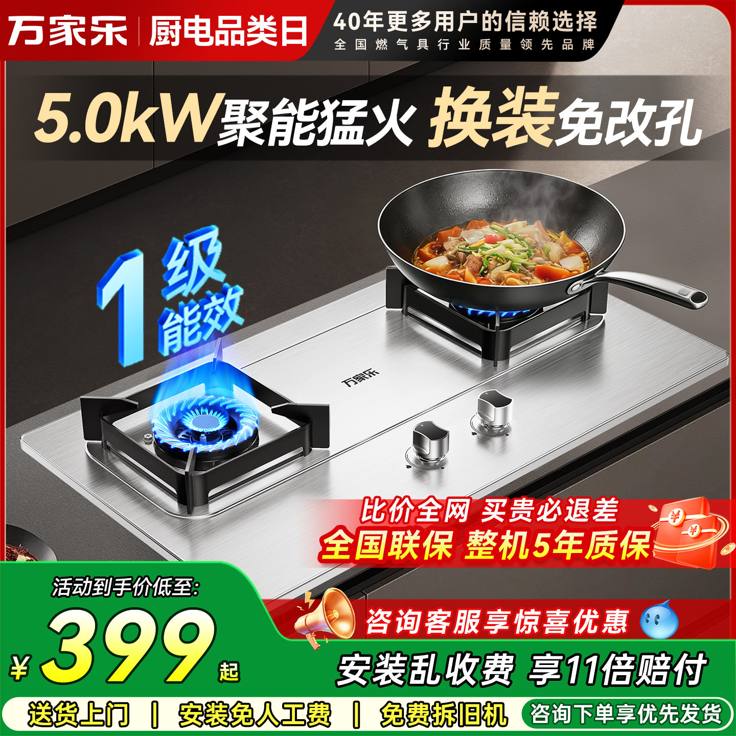 万家乐AY5G燃气灶双灶不锈钢灶台天然液化气灶嵌入式煤气家用AY4G