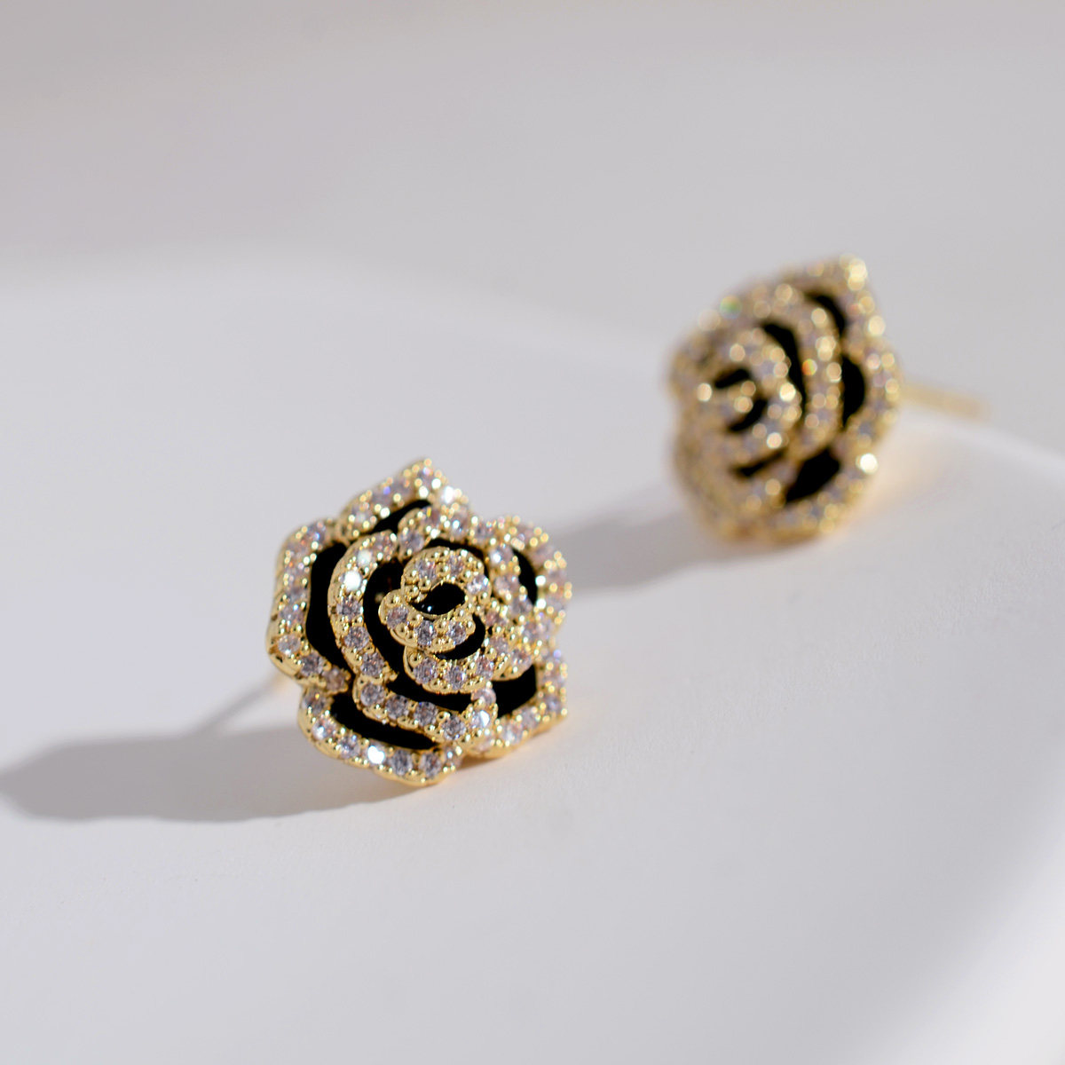 黑色小钻立体山茶花耳钉仙女风耳环2025年新款潮耳饰超仙气质高级