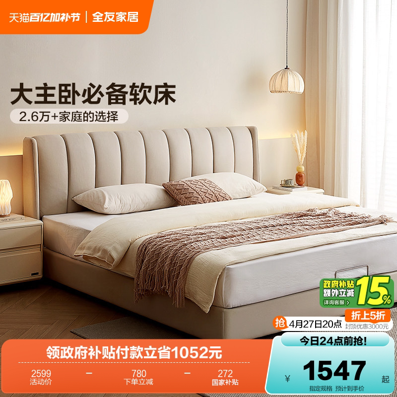 全友家居奶油风琴键双人大床主卧室软包床科技布艺高箱储物落地床