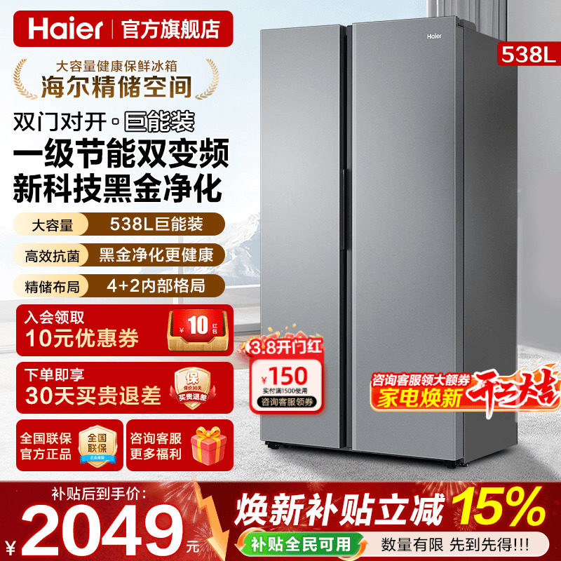 海尔电冰箱538L双门大容量两门对开门一级能效家用风冷无霜旗舰店