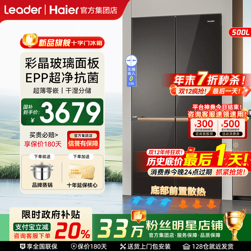 【补贴20%】海尔冰箱500L家用十字四门多门统帅529超薄零嵌旗舰店
