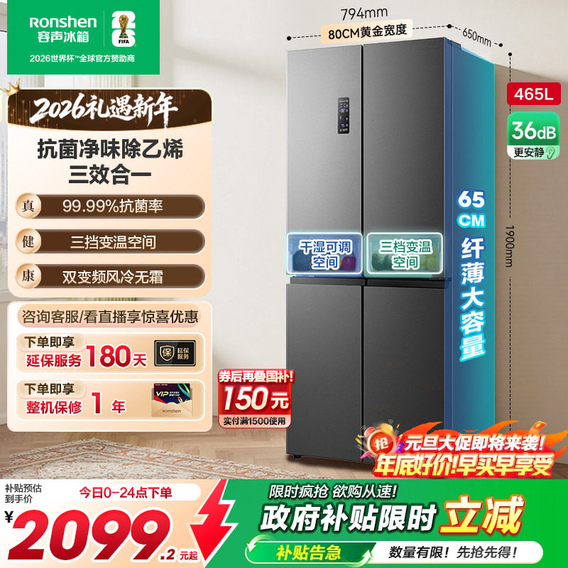 容声465L十字双开四门大容量一级风冷无霜薄嵌入家用冰箱换新补贴