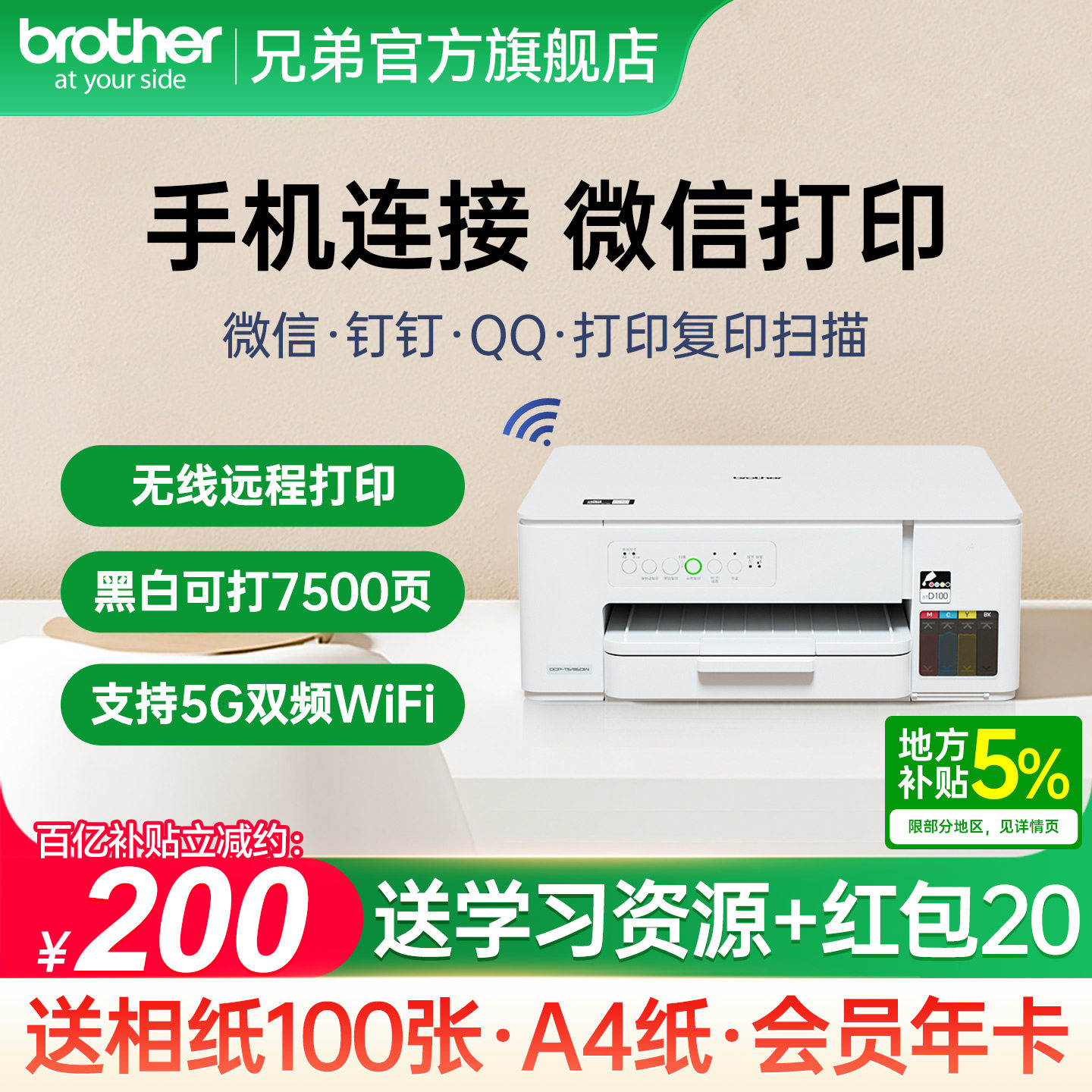 兄弟打印机DCP-T436W彩色喷墨无线手机wifi打印复印扫描一体机家用小型学