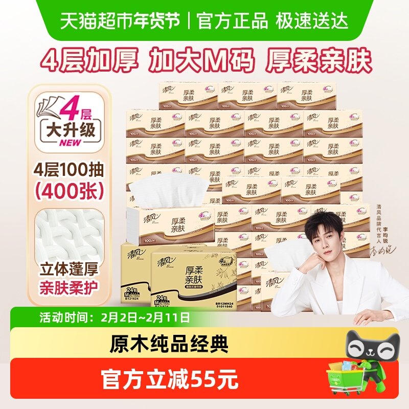 • 泡美丽»»【李昀锐同款】下拉享优惠清风抽纸厚柔原木4层100抽48包M码纸巾