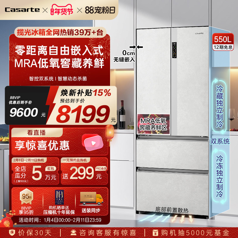 以旧换新卡萨帝揽光冰箱550L零嵌法式四门一级嵌入式超薄无霜家用