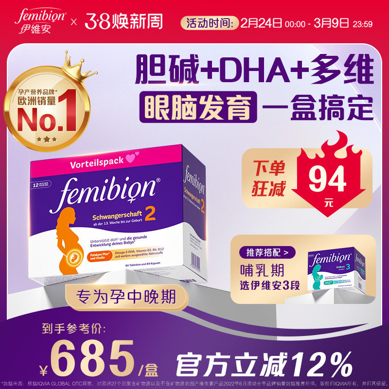 Femibion2段孕中晚期DHA胆碱多维营养品 12周量 效期27年2月