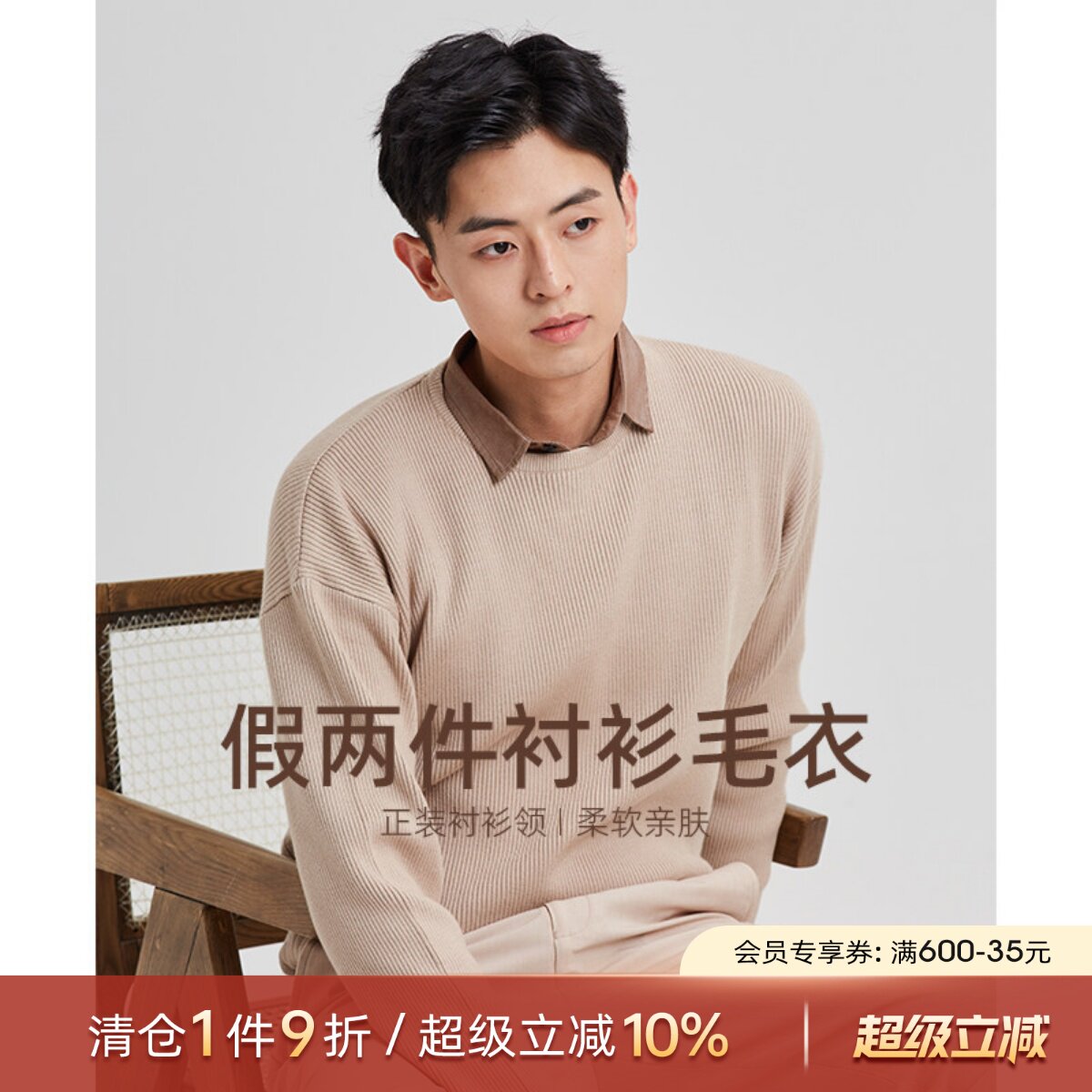 searoad海上公路假两件毛衣男衬衫领秋冬保暖长袖内搭针织衫男士