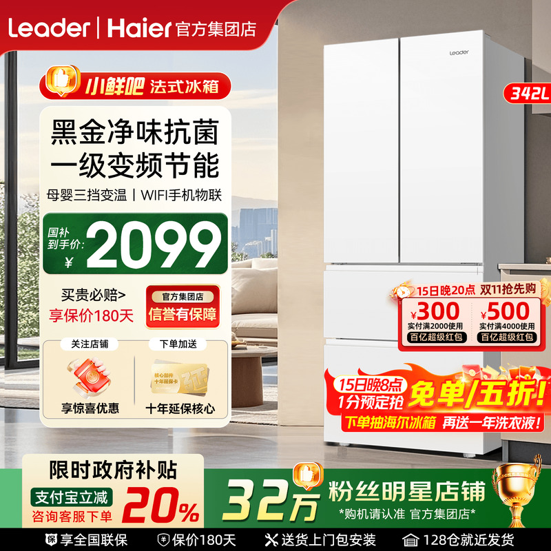 国补20%]海尔电冰箱342L家用法式四开门统帅一级能效变频无霜旗舰