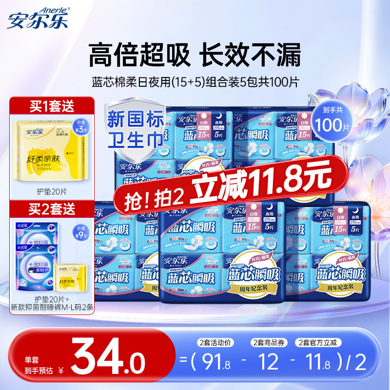 【新国标认证】安尔乐姨妈巾日夜组合蓝芯棉柔纤巧透气正品卫生巾