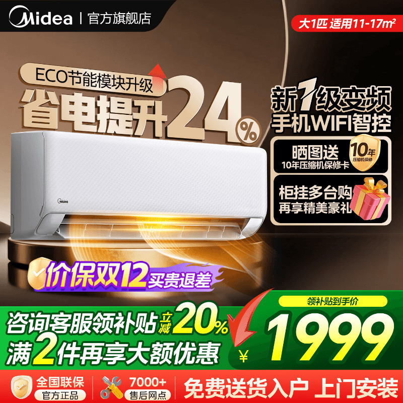 美的空调新一级变频家用大1匹1.5匹挂机酷清凉官方旗舰店