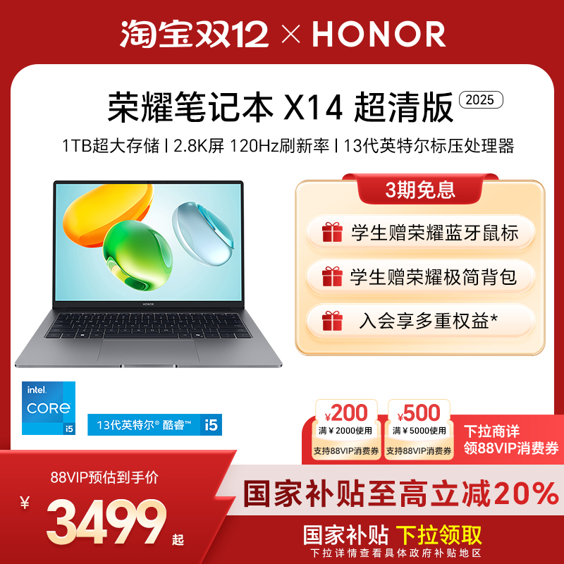 【政府补贴20%】荣耀笔记本X14 超清版13代酷睿标压处理器2.8K 120H