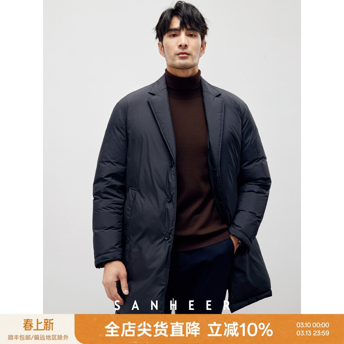 绅士的冬季 高蓬松保暖白鹅绒男士西装领中长款羽绒服外套 DAD294