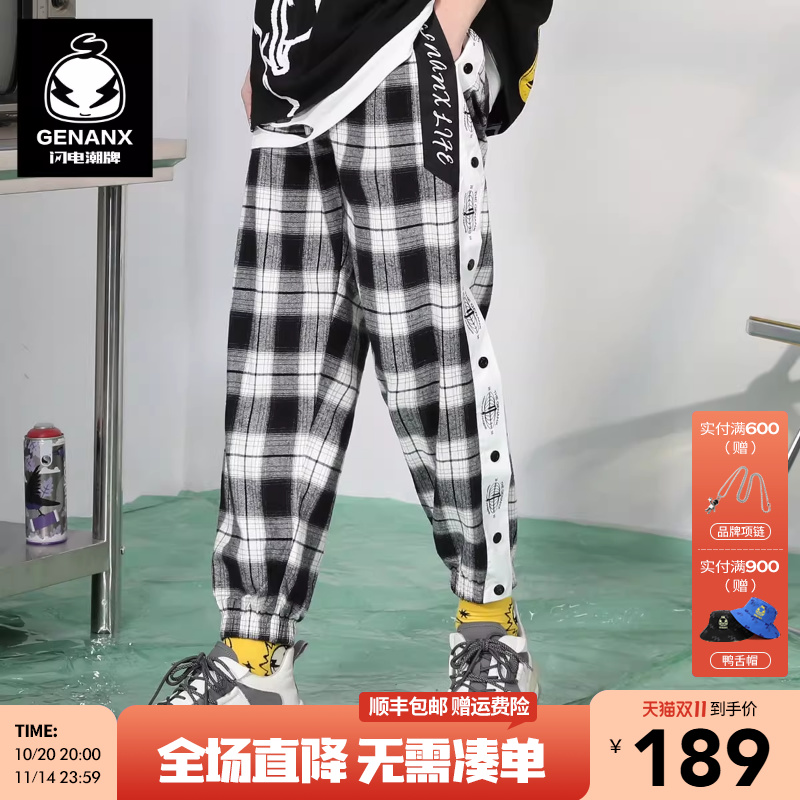 GENANX闪电潮牌排扣裤运动休闲小脚长裤子男卫裤束脚裤黑白格子裤