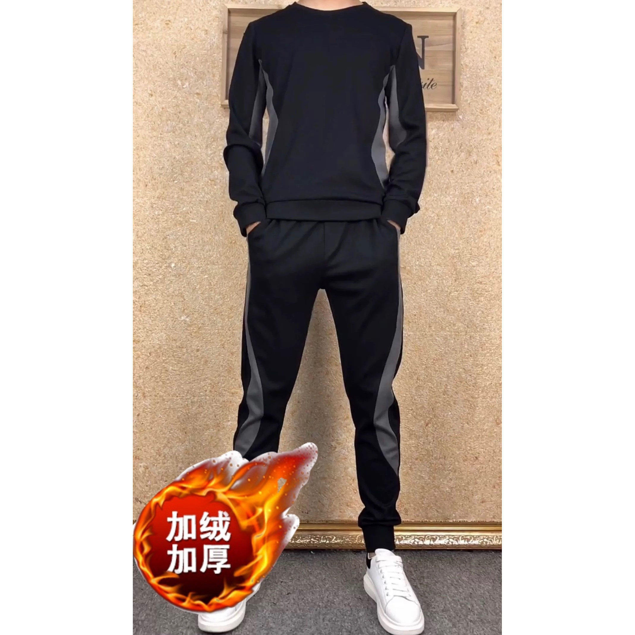 抖音休闲加绒套装男士2025冬季新款时尚潮流修身显瘦圆领两件套男