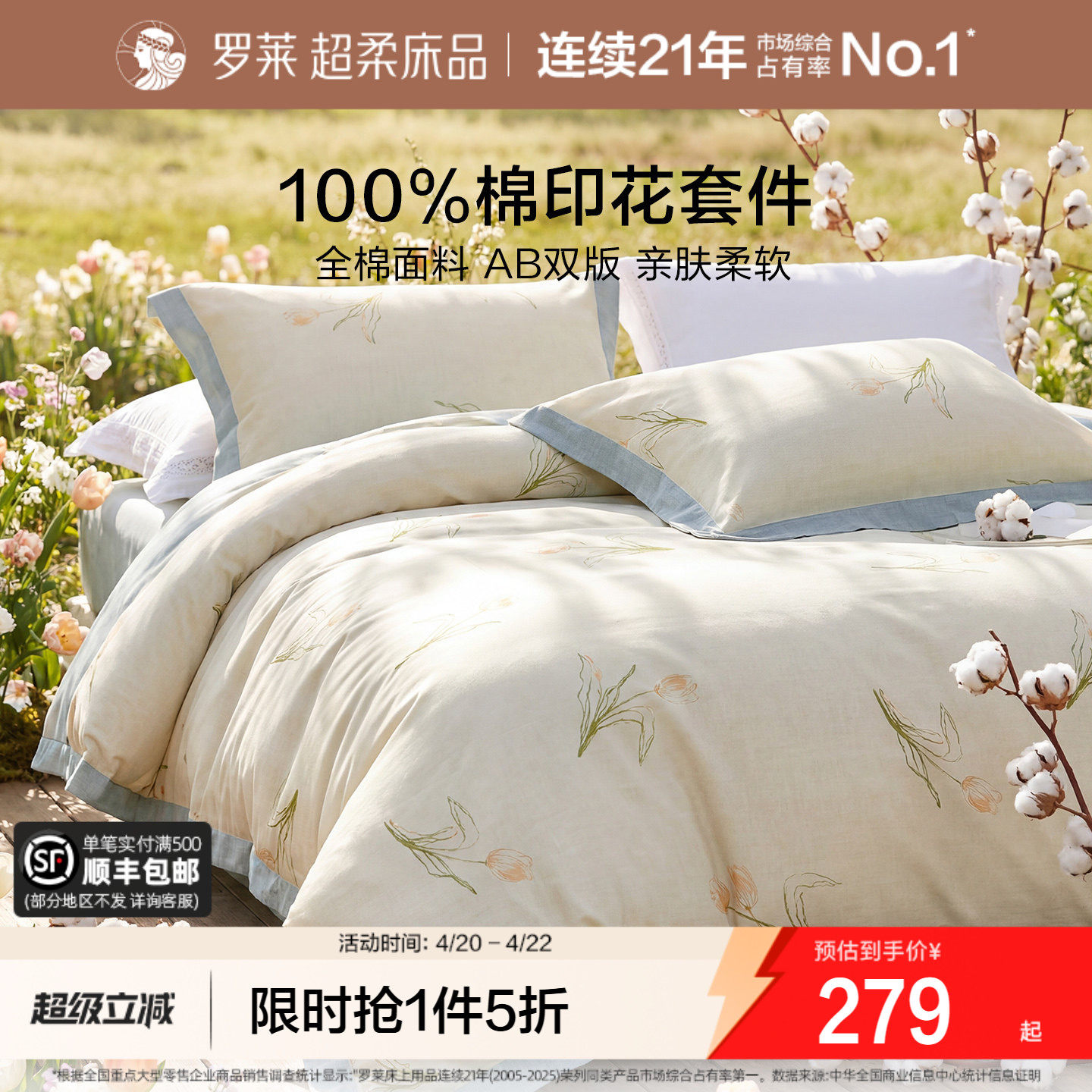 罗莱家纺床上四件套全棉纯棉被套床单床笠被罩双人棉套件宿舍