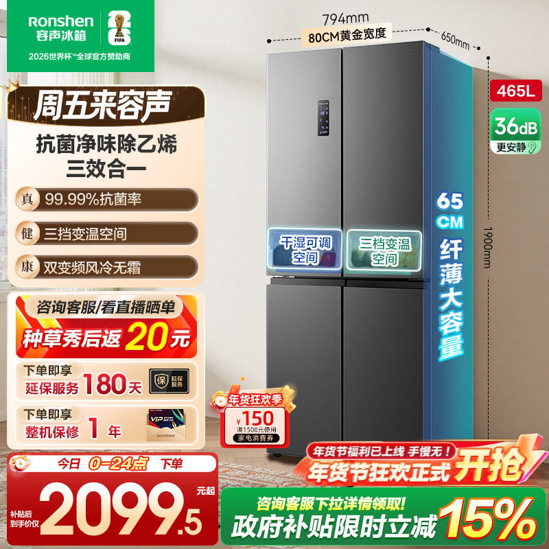 容声465L十字双开四门大容量一级风冷无霜薄嵌入家用冰箱换新补贴