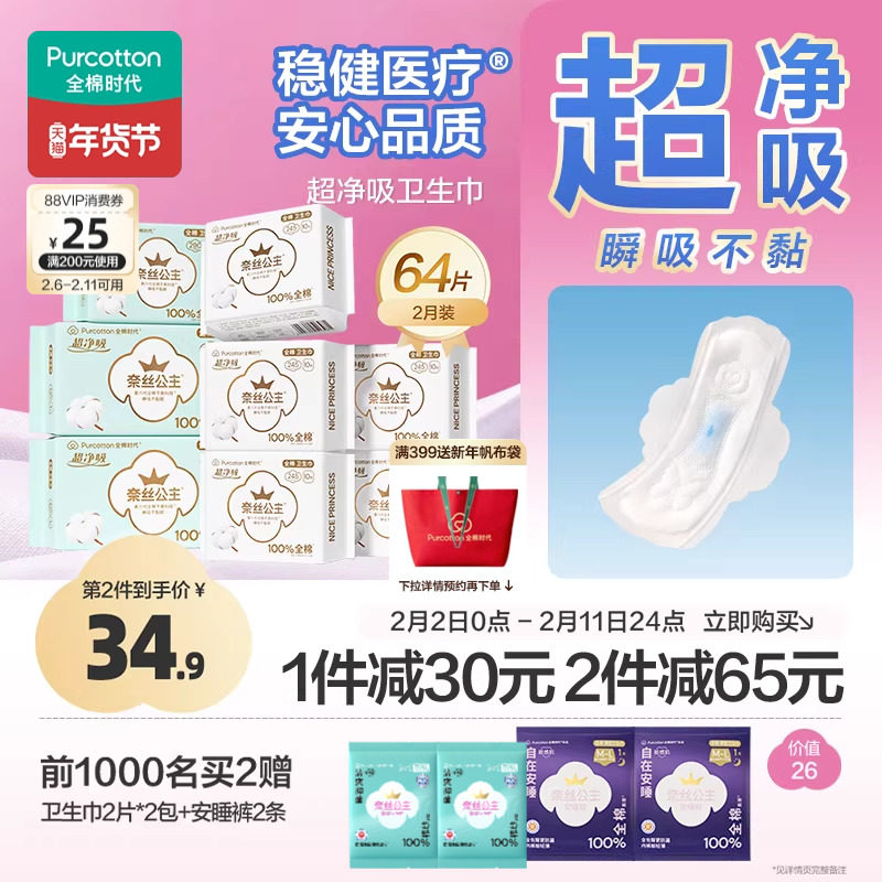 全棉时代奈丝公主纯棉卫生巾超薄日夜组合2月装64片